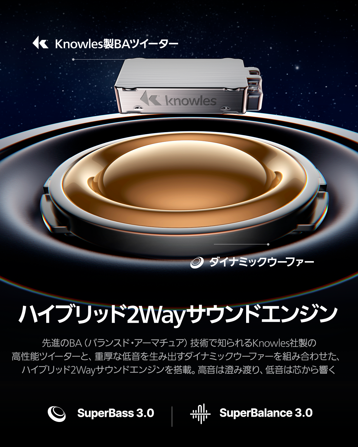 さらに、Dolby Spatial Audioによる立体的な音場表現と、Knowles製BAドライバーによる高精度なディテール描写が融合。ハイレゾワイヤレス対応/LDAC対応により、細部まで繊細かつクリアに響くサウンドを体験いただけます。