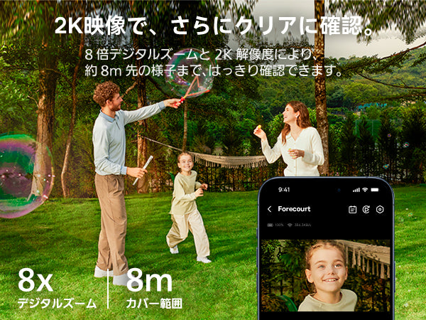 ソーラー給電対応、2K高画質でしっかり見守る。