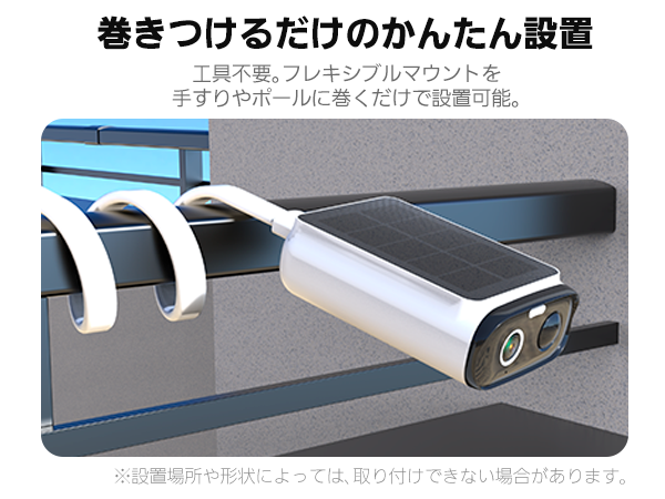 さらに、フレキシブルマウント採用で、手すりやポールに巻き付けるだけの簡単設置が可能です。