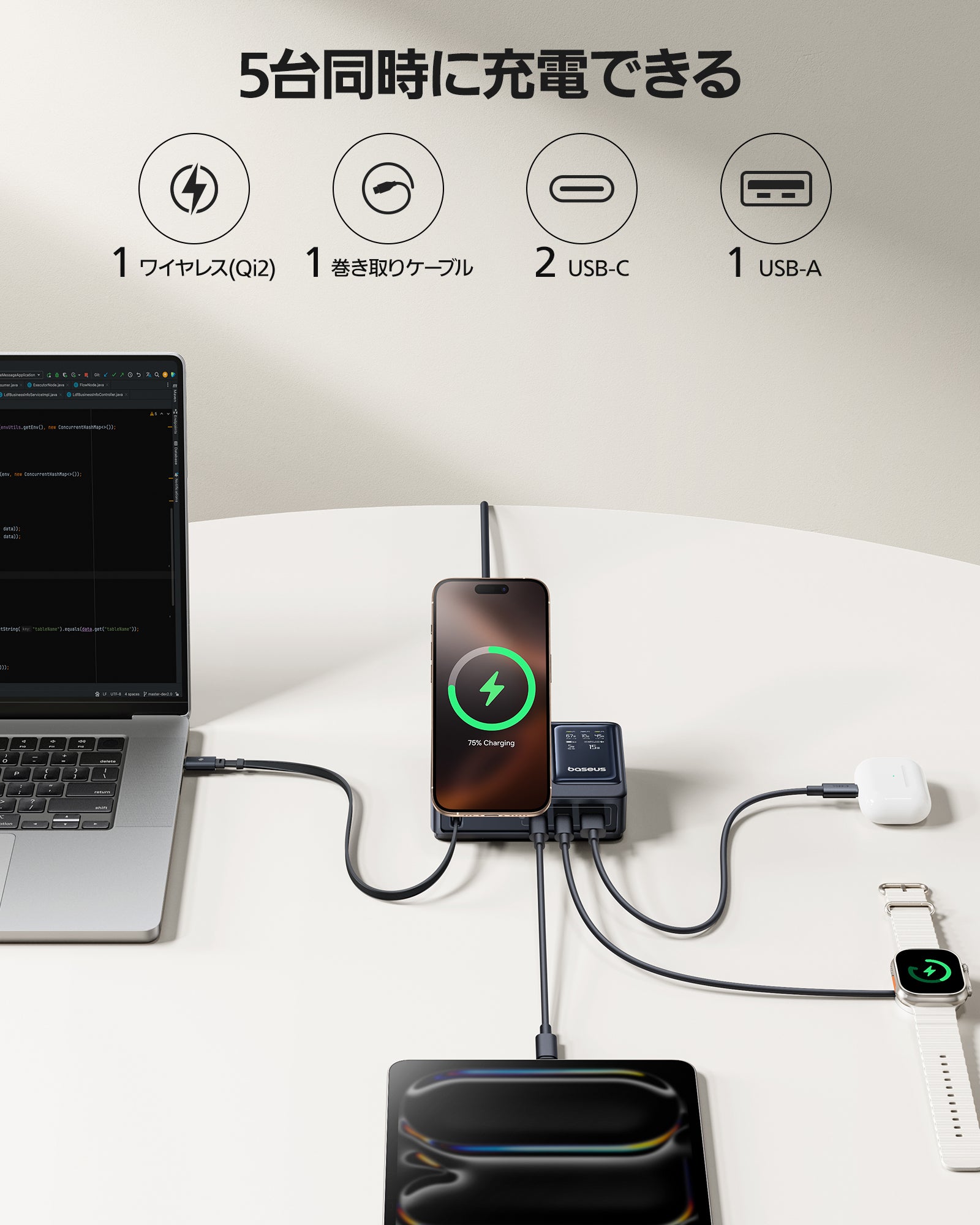Qi2ワイヤレス充電スタンド、有線PD急速充電、巻き取り式USB-Cケーブルをひとつにまとめた多機能充電ステーション