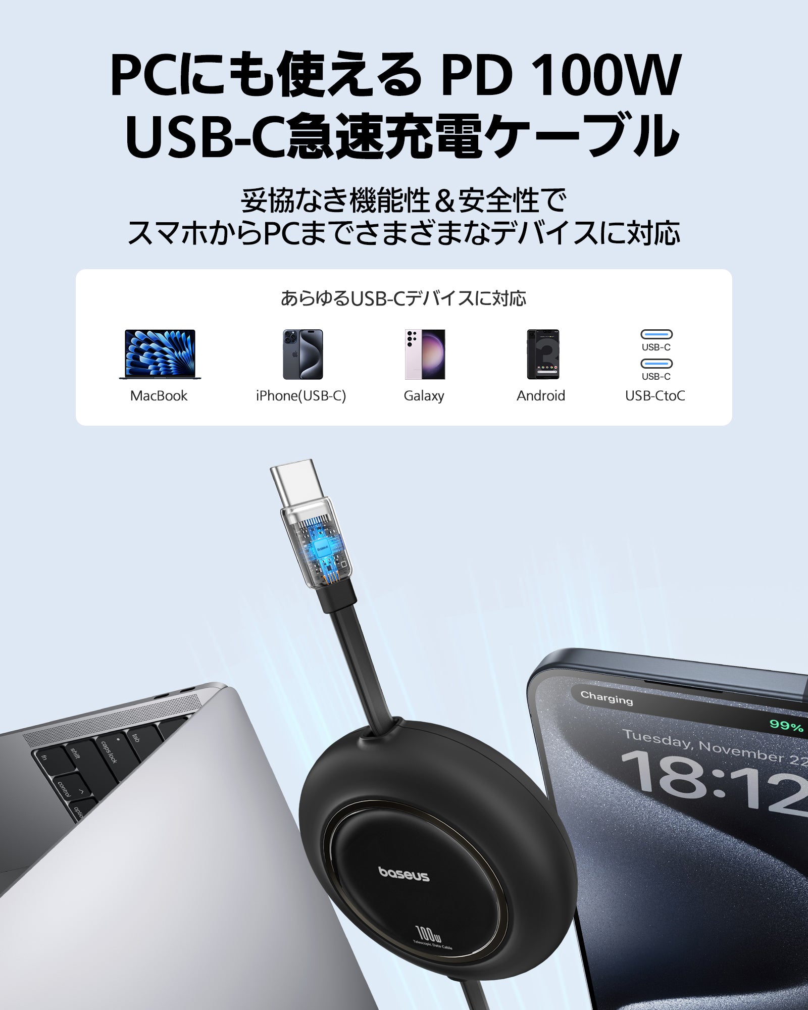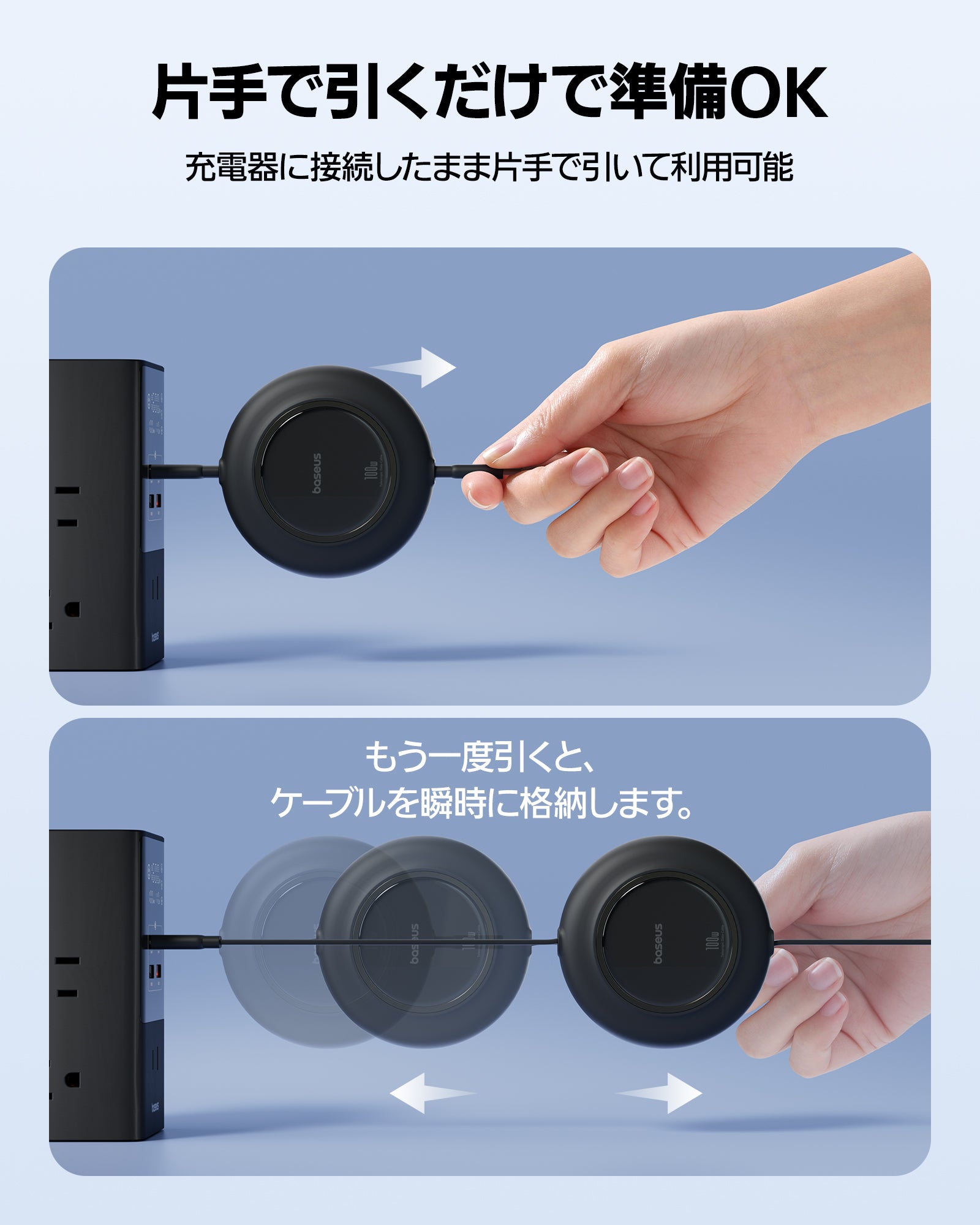 省スペース, 480Mbps 高速データ転送, 片引き、両側とも伸縮可能, PD 100W 急速充電