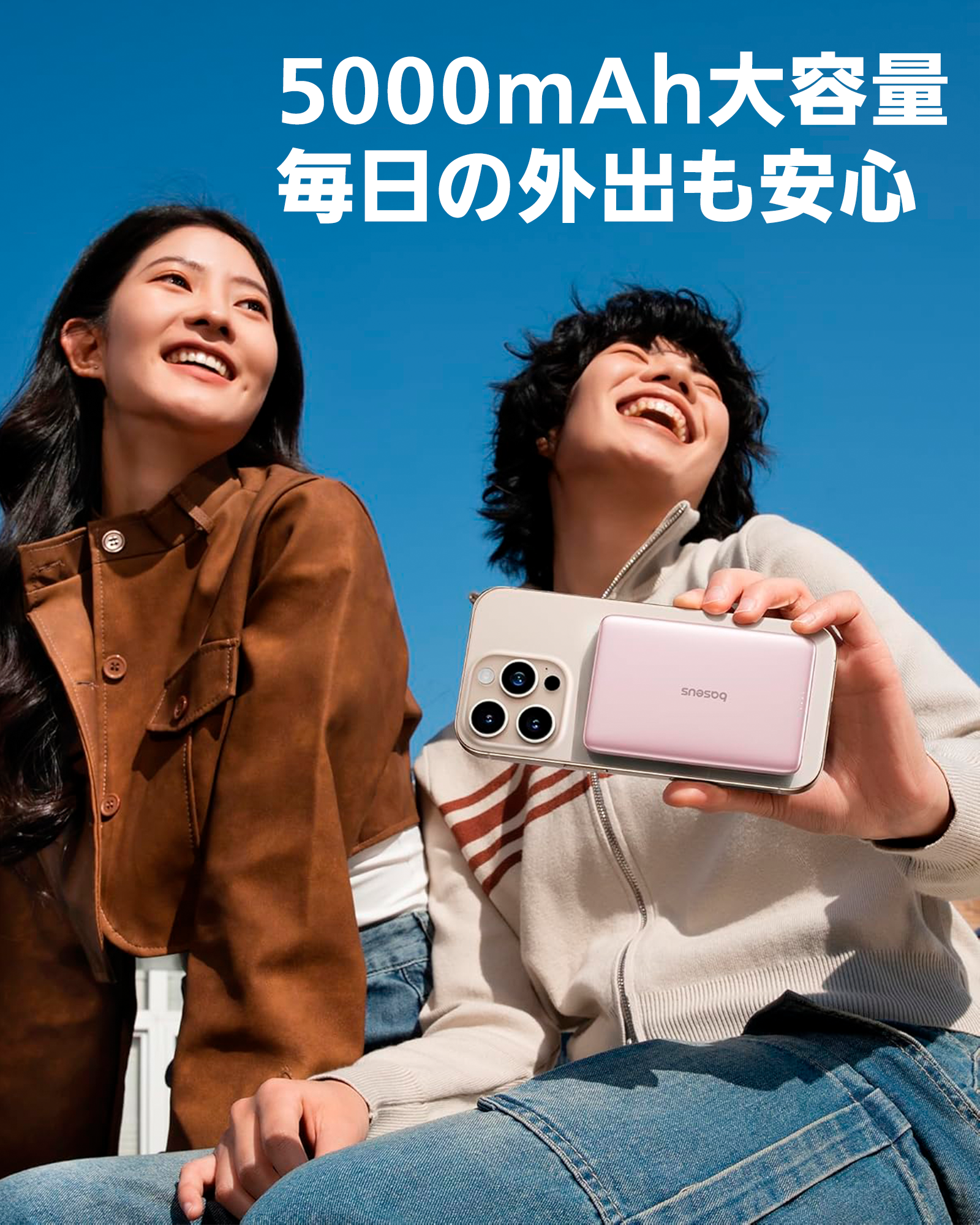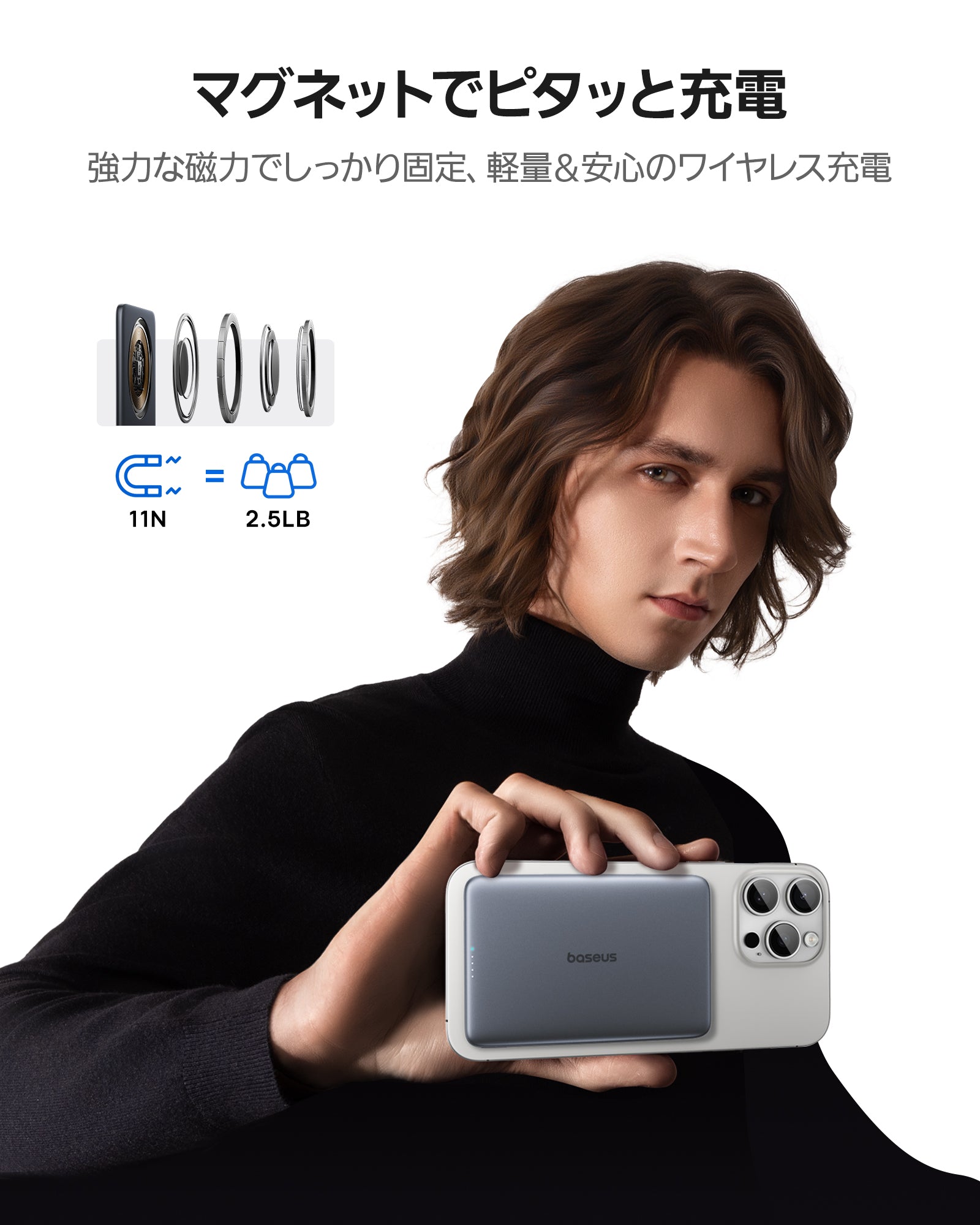 軽やかに持ち運べるのに、頼れる充電力はしっかり。ふとした瞬間にスマホの電池が尽きても、スマートに取り出してピタッと装着。