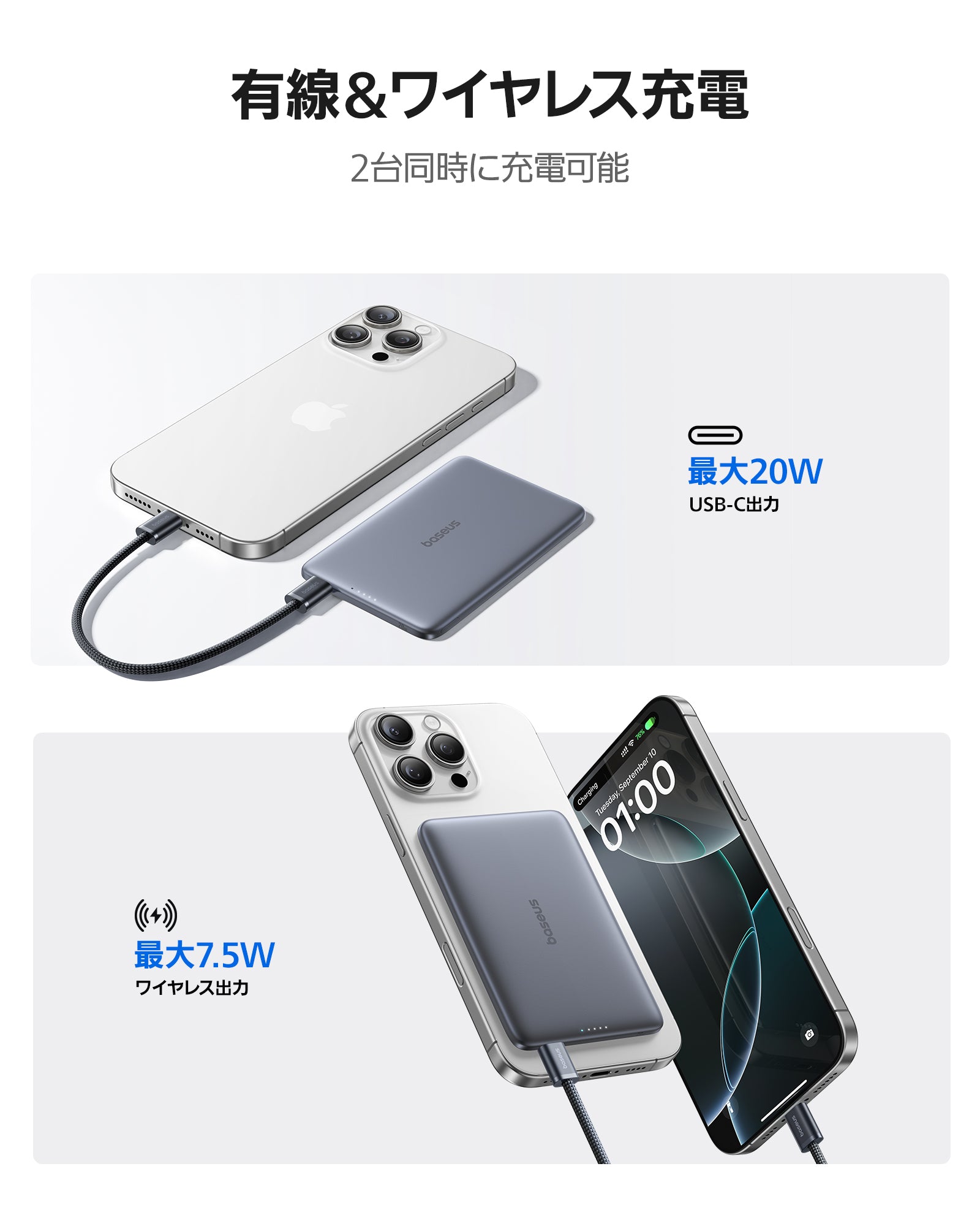 USB-C 出力: 5V⎓2.4A ; 9V⎓2.22Α ; 12V⎓1.5A | ワイヤレス出力:最大15W ※使用機器により、5W/7.5W/15Wに自動調整。| 合計出力:5V⎓2.4A