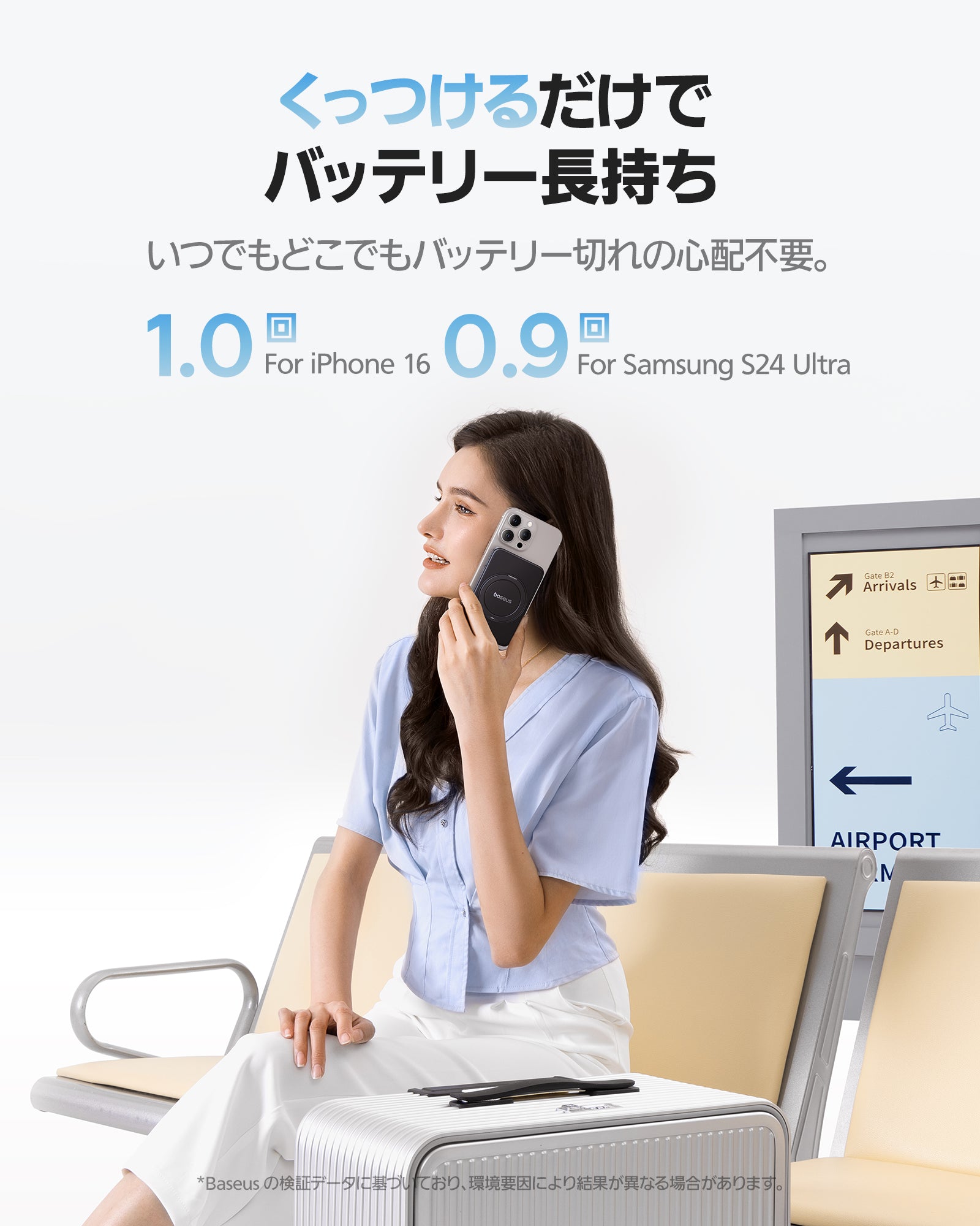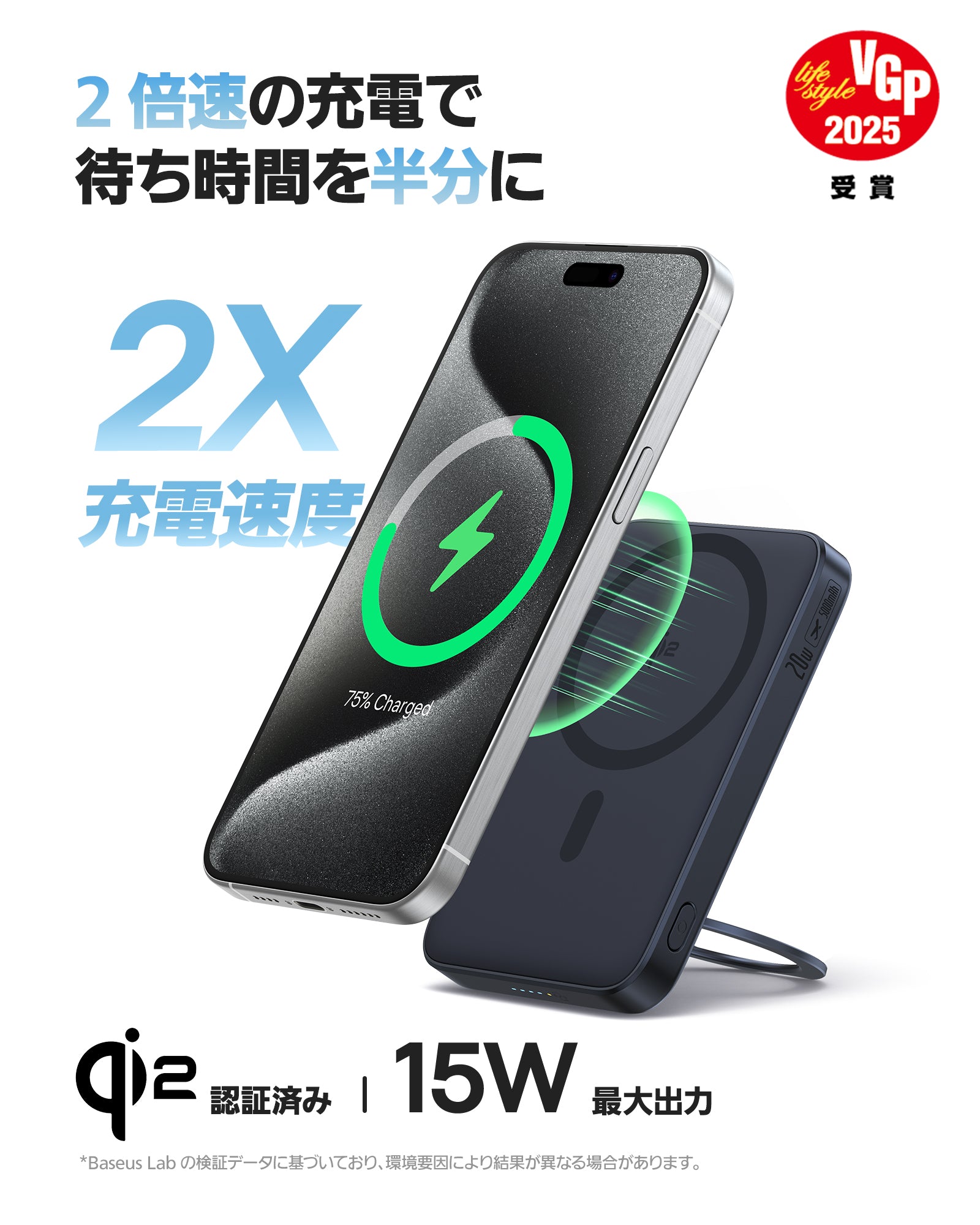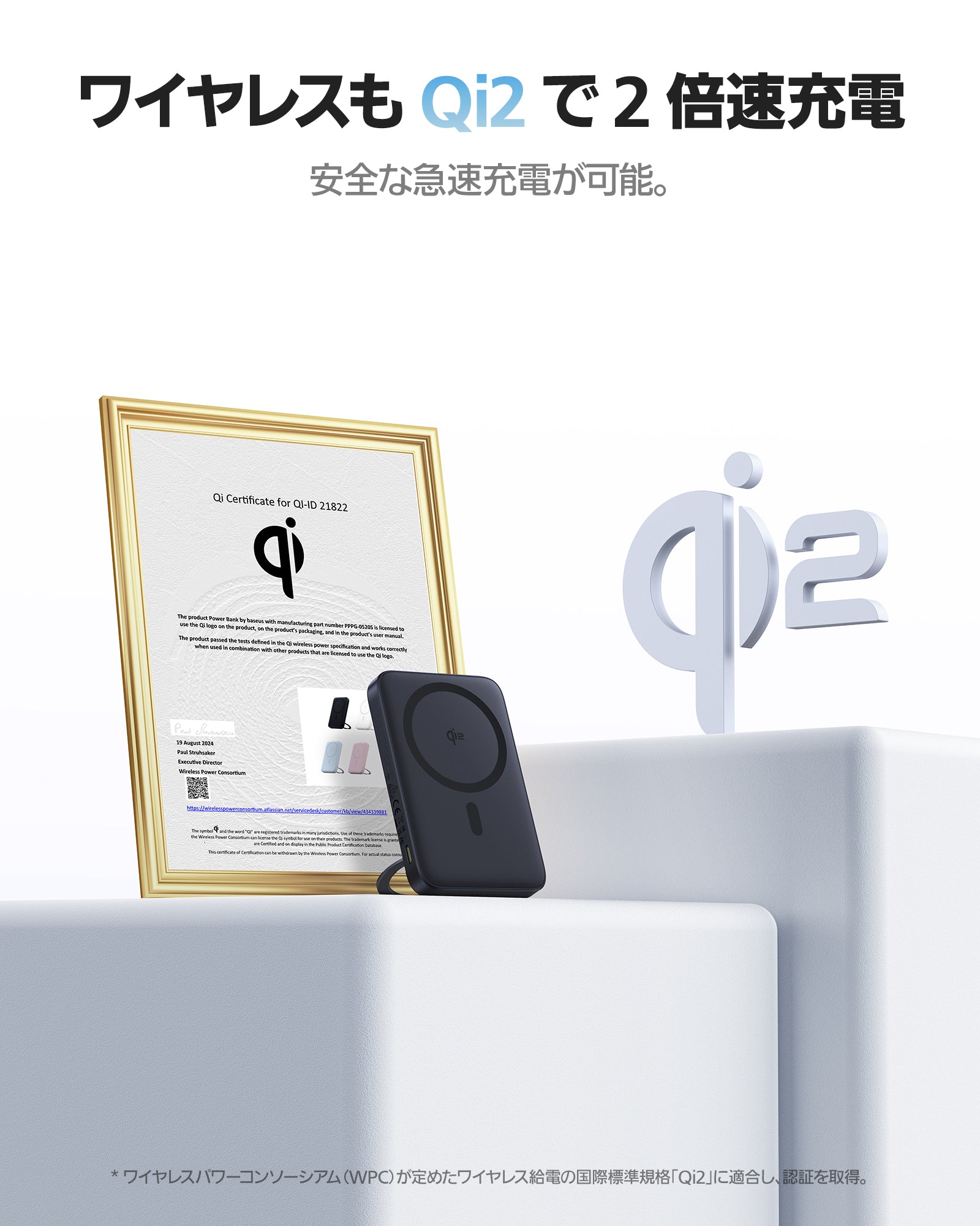 「ワイヤレス充電」:iPhone 16 15 14 13 12 シリーズ/Galaxy Sシリーズ/その他のQi2またはQi対応のデバイス。