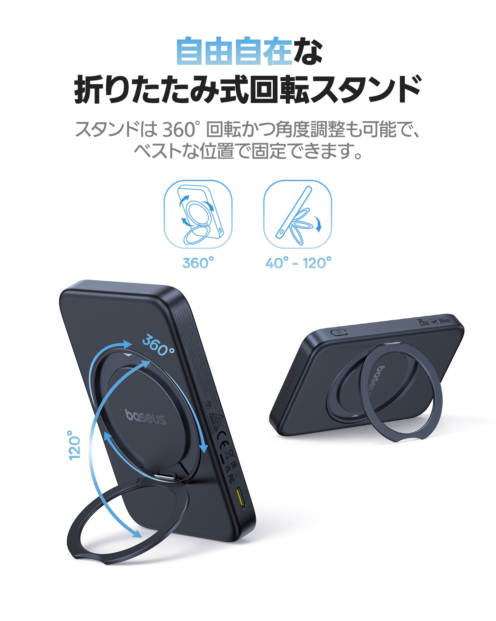 Qi2認証 15W ワイヤレス急速充電, 360°回転式スマホリング搭載, PD 20W USB-C急速充電, アルミニウム合金採用、頑丈で長持ち